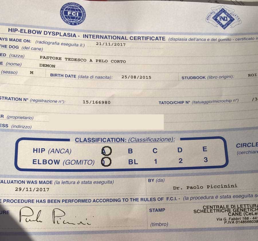 con Affisso e Pedigree ... ... cucciolata " M " Mamma : HANNELORE DA CASCINA MORETTA (Vasco del Ceresio x Cockys da C.M. Padre : ASHAN-KHAN EMSI-HAUS LO15111876 (A-0)